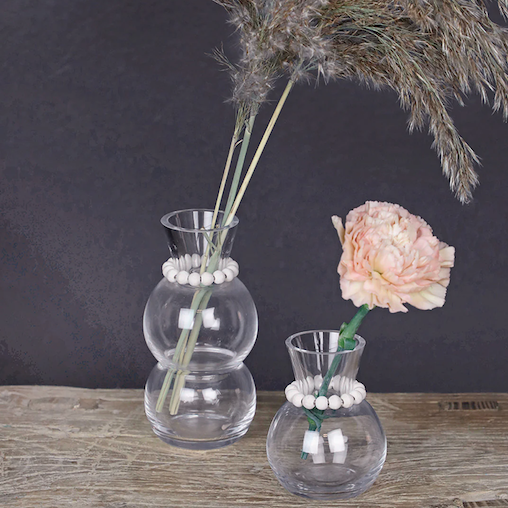 バブル ミニチュア ガラス花瓶はガラス製で、木製ビーズで作られた花輪で飾られています。このシンプルで美しい花瓶は、花瓶とお花の双方を美しく魅せるので一輪挿しにも最適です。