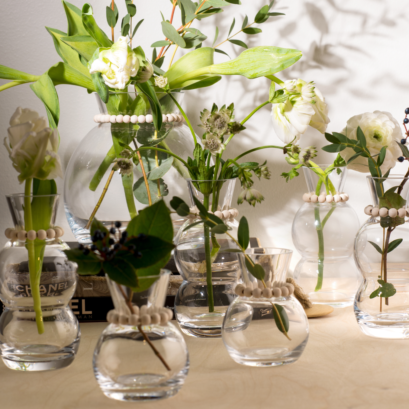 Kupla (バブル) ミニチュア ガラス花瓶は小さくて美しく、木製ビーズで作られた花輪で飾られています。単体でも、さまざまなシーンの一部としても魅力的です。時代を超えたクラシック、木とガラスの魅力的な組み合わせをお楽しみください。