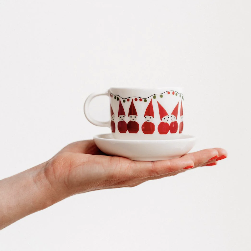 Elf-themed espresso set brings a joy to your table. Use it for coffee, tea, or mulled wine. Use the small plate for lemons, gingerbread cookies, or other treats. Together, separately. Joy to your tableware.