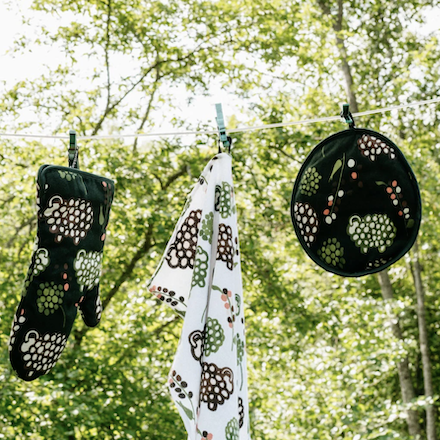 The Pässit-kedolla series celebrates the anniversary of Pässit. The cotton bat glove is soft and has a hanging loop. Bring Aarika's timeless design home!