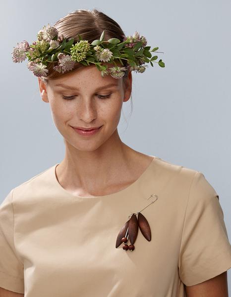 Olos brooch With this trendy brooch designed by Marianne Siponmaa, you can fasten a plush scarf or poncho and update your style in a personalised way. Wood, jewellery metal length of needle 6 cm/2.5 cm. Handmade in Finland.