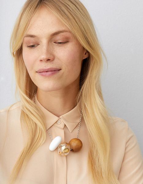 The different materials in the shimmering gold Kosmos necklace combine to create a beautiful and impressive piece of jewellery perfect for a sophisticated night out. The pieces can be seen as the earth, a piece of sky and the universe itself. Designed by Pauliina Aarikka.
