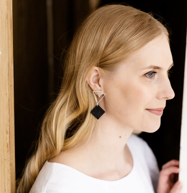Hand-dyed Evita earrings have stylish geometric shapes. They are made of wood and jewellery metal. They are easy to use and combine with other Aarikka collections.